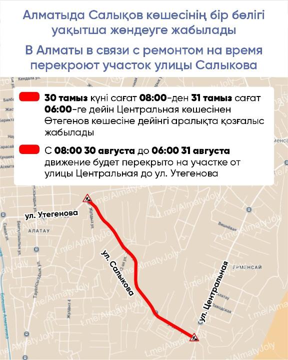 В связи с этим, с 08:00 30 августа до 06:00 31 августа будет закрыто движение на участке от улицы Центральная до улицы Өтегенов.
