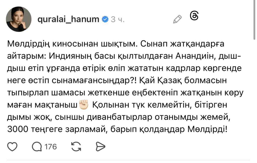 «Если не можете снять фильм, не думайте, что можно оскорблять народ и манипуляциями загонять людей в кинотеатры, как скот. Профессиональный режиссёр Ермек Турсунов не зря плачет — жанр кино превратился в что-то вроде “Ананди” (индийский сериал). На хорошие фильмы идут и без рекламы. А те, кто ради денег то гивы проводят, то тренинги устраивают, бегают из стороны в сторону как Фигаро — вот настоящие бездельники. Не будучи специалистом ни в одной области, бегать сразу в десяти ради заработка — вредно и для здоровья, и для будущего. Тех, кто грубит народу, нужно привлечь к ответственности по закону», — написала Камшат Тасболат.